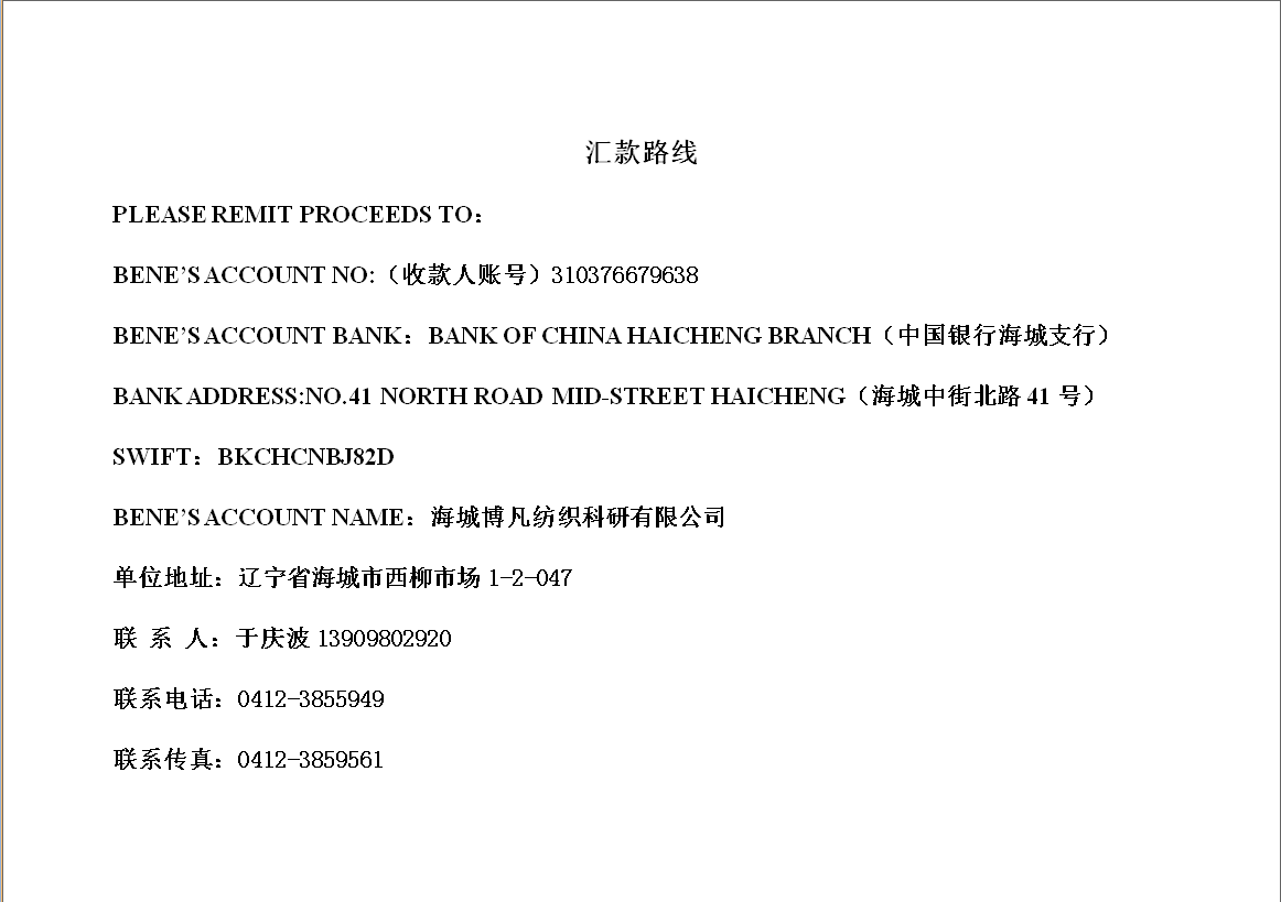 | Foreign currency account | BANK OF CHINA HAICHENG BRANCH, 310376679638 , NO.41 NORTH ROAD MID-STREET HAICHENG | REMIT LINE | REMIT LINE |